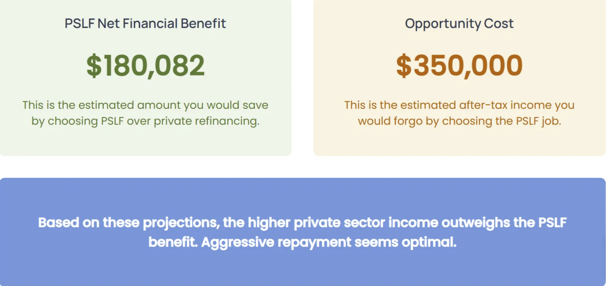 Starting Debt: Waving goodbye to that number on the yearly debt statement that resembles the GDP of a small country after ten years of service? Yes, please. A very high loan balance ($300k+) makes the PSLF benefit large enough that it can overcome even a significant Opportunity cost. A low loan balance (<$150k) often makes the benefit too small to justify taking a lower salary. Play around with this concept.